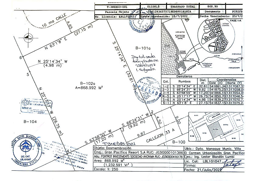 Land for Sale in Gran Pacifica, Nicaragua. The property, designated as B-102A, is located in the tranquil San Diego Viejo area, known for its natural beauty and serene environment. This spacious plot encompasses 868.99 m², offering ample room to build your dream home or vacation retreat. The charm of Gran Pacifica lies in its growing community, where international investors and buyers are increasingly drawn to its unique lifestyle, stunning landscapes, and investment potential. This vibrant area is not only perfect for relaxation but also ripe with opportunities for growth. Immerse yourself in the culture, enjoy the picturesque beaches, and take advantage of the recreational activities that await. Learn more in these informative videos: